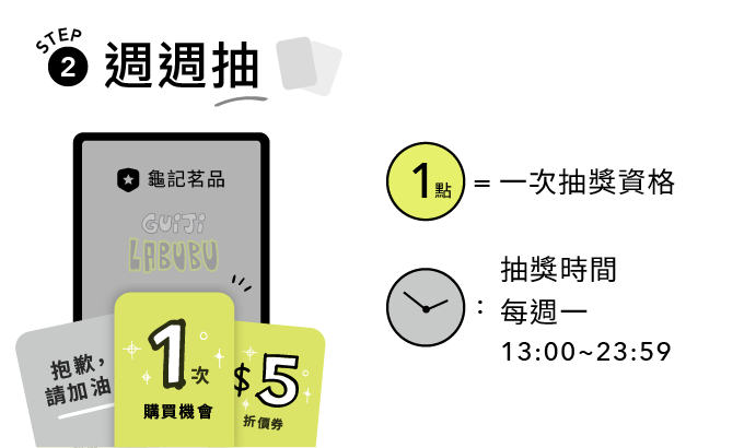 – 每滿 $200 = 1 點抽獎資格,當週抽獎點數資格可累積。