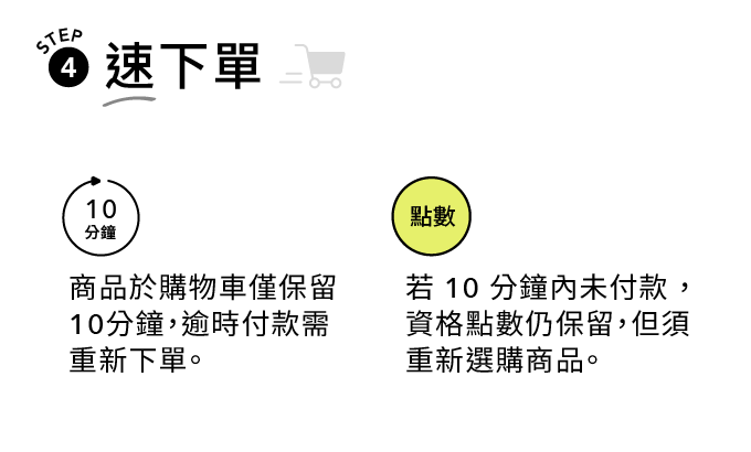 – 若 10 分鐘內未付款,資格點數仍保留,但須重新選購商品。