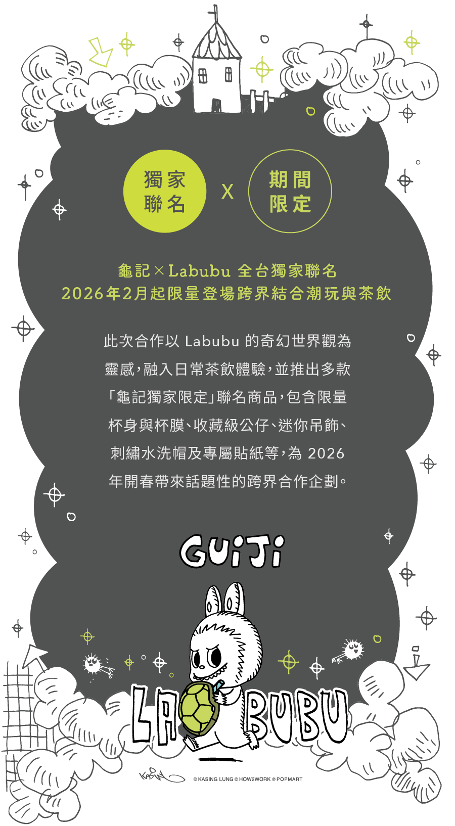 「Dream Big, Live Fresh」對龜記來說,不只是品牌標語,更是一種保持好奇、持續探索的生活態度。在忙碌與混亂交錯的日子裡,一杯療癒的茶飲,加上Labubu的壞壞可愛,都能成為日常的陪伴。