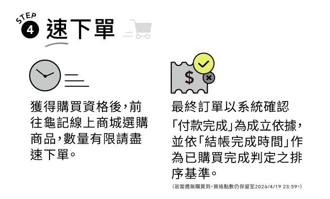 – 獲得購買資格後,前往龜記線上商城選購商品,數量有限請盡快下單。